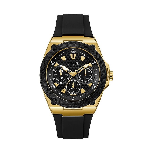 Guess Legacy Herrenuhr W1049G5 Multifunktion. Edelstahlgehäuse, goldfarbene- und schwarze Beschichtung, poliert / mattiert; Silikonarmband, Schwarz, Lesen Sie mehr.