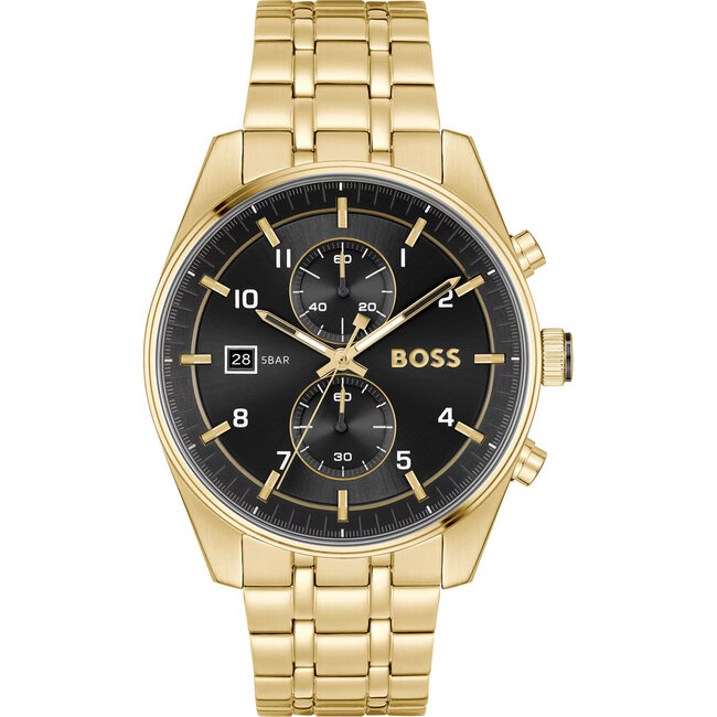 BOSS BLACK Herrenuhr 1514152 Edelstahl vergoldet Herausnehmbare Elemente Edelstahlband Gold Gliederband Ziffernblatt Schwarz Mineral 5bar · Produktdetails. Lesen Sie mehr.