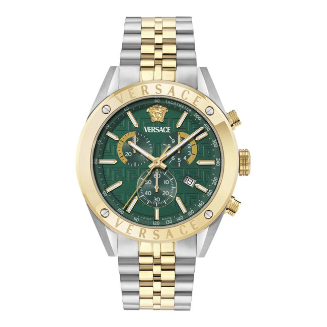 Die Versace Athletic Chrono zieht mit einem klassischen Guilloché Zifferblatt auf sich, das durch dynamische Chronographenzähler verstärkt wird. Kombiniert mit einem verfeinerten Metallarmband und untergebracht in einem markanten 44-mm-Gehäuse, verbindet diese Uhr präzise Leistung mit unverkennbarer Versace-Raffinesse.